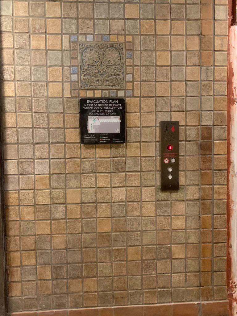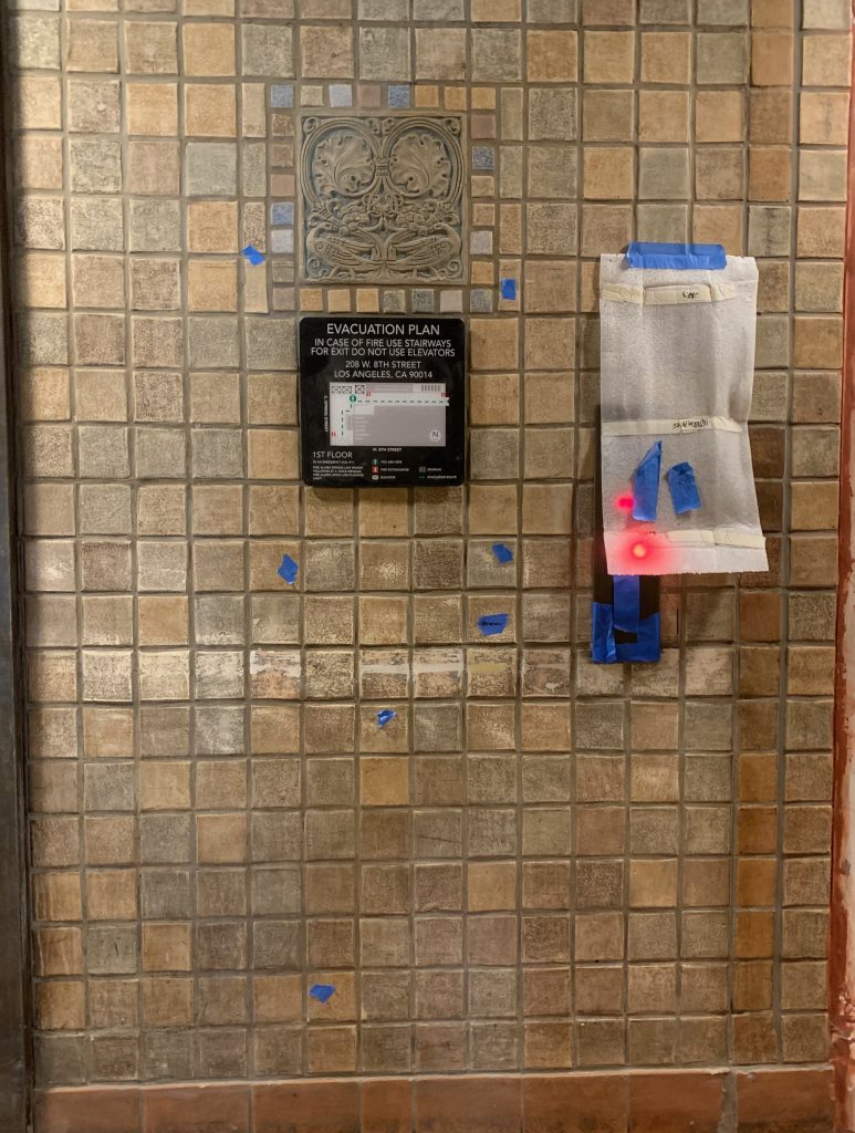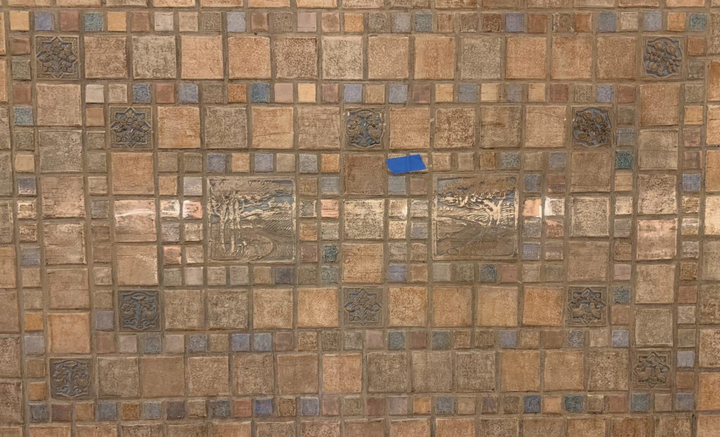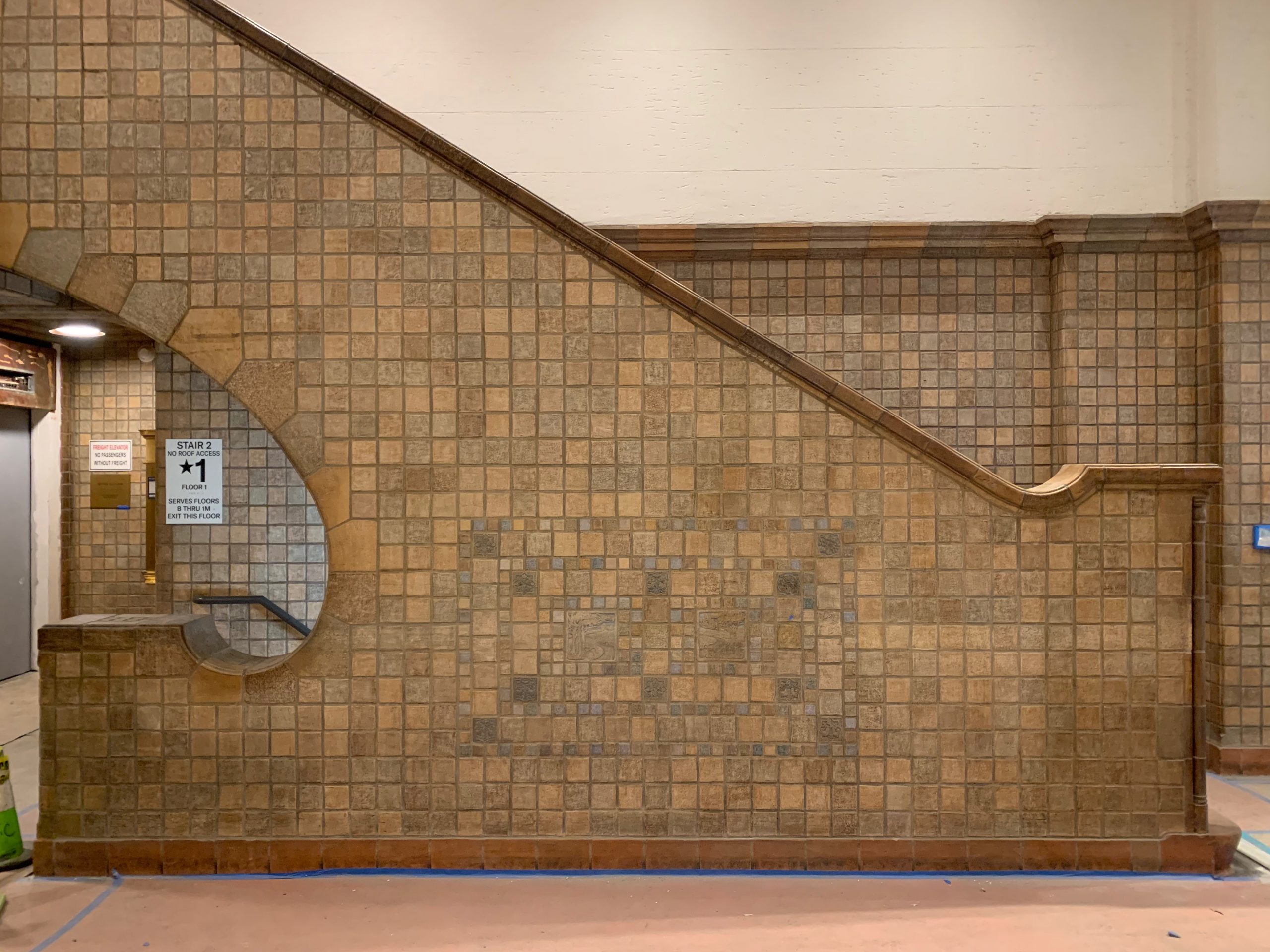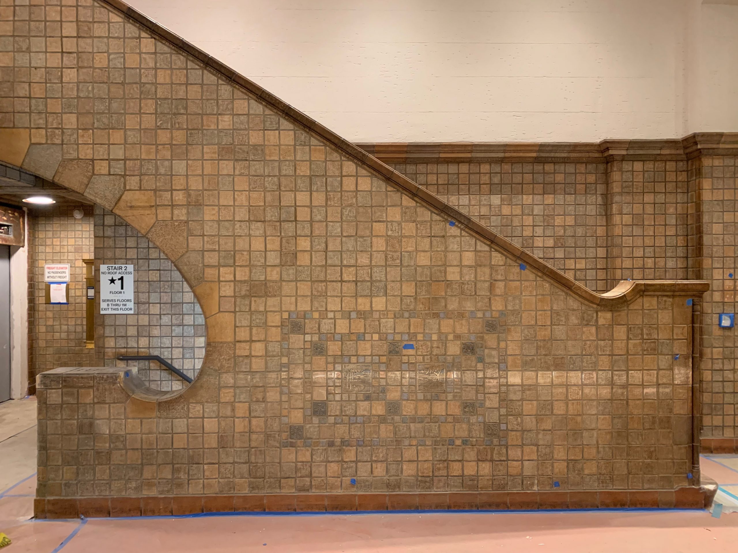 The Lane Building, a badly damaged, Batchelder tile from 1923, downtown Los Angeles, just underwent renovation. It’s unique lobby has a distinct curved archway under the stairs. Spectra Company.