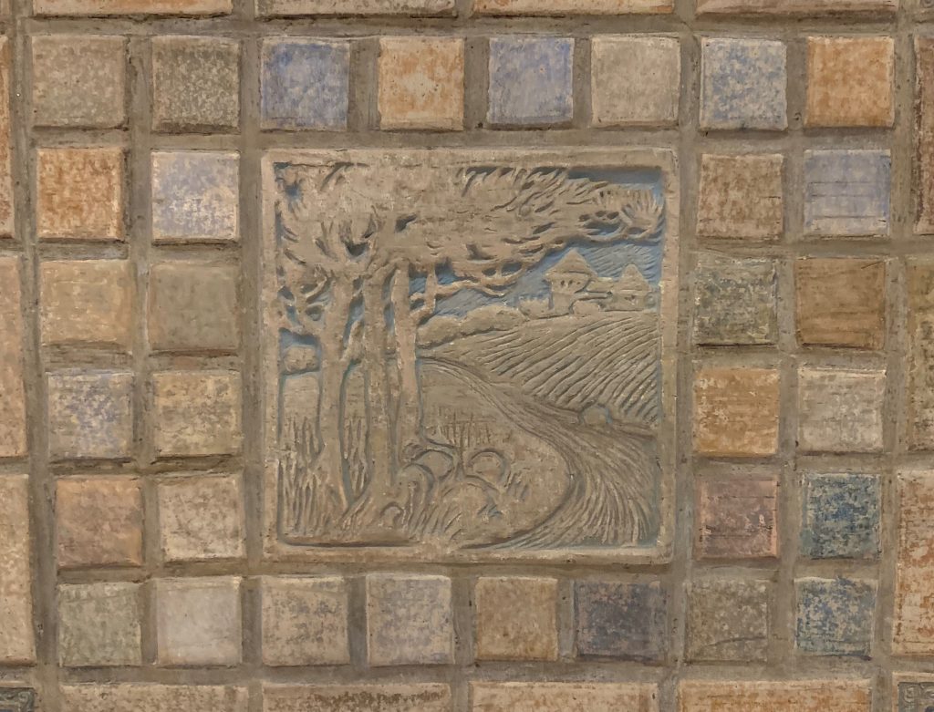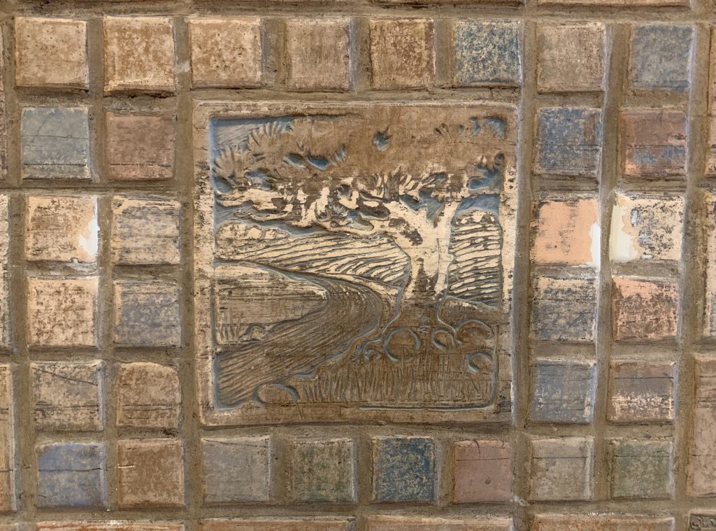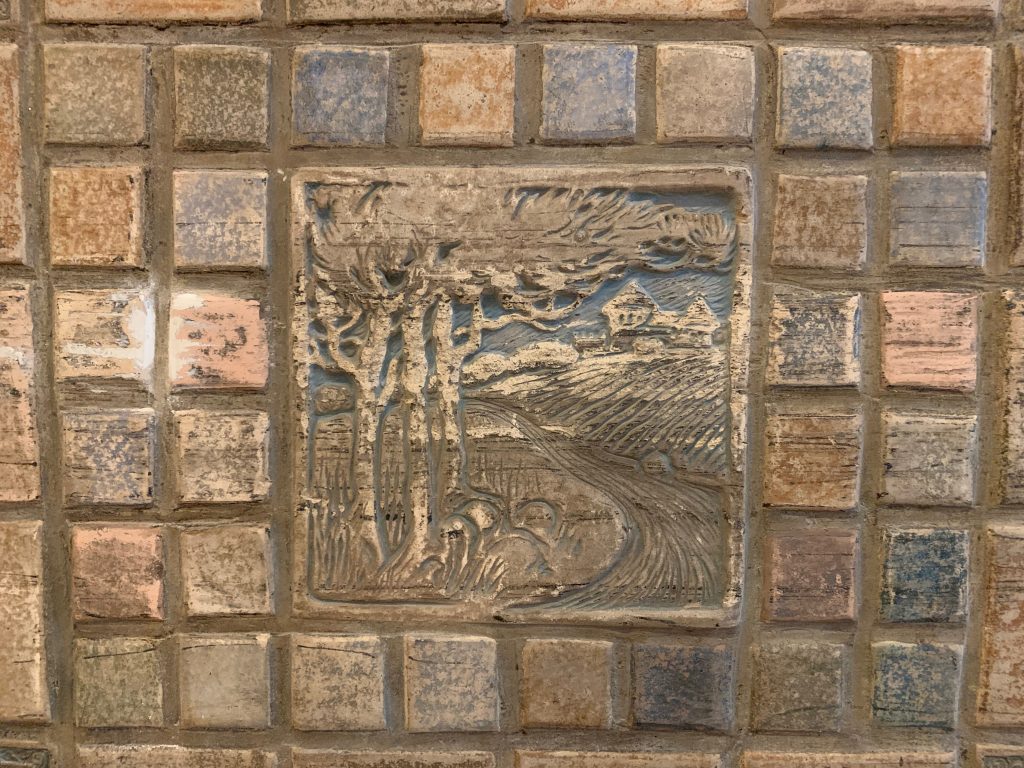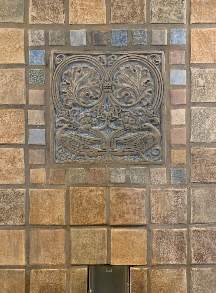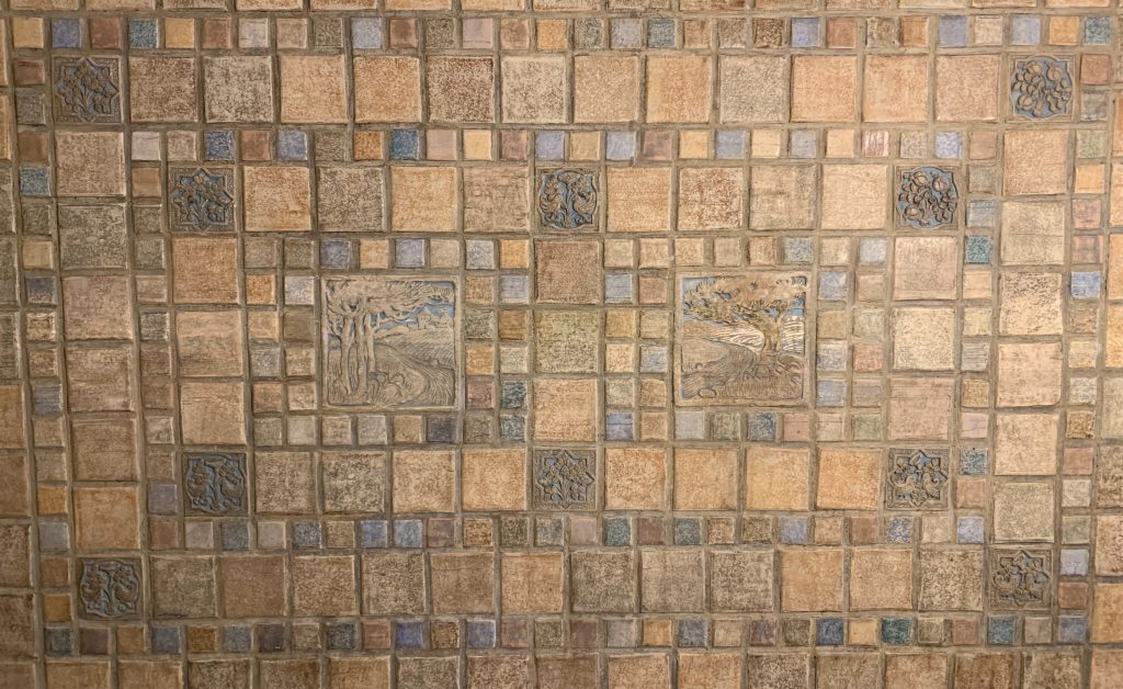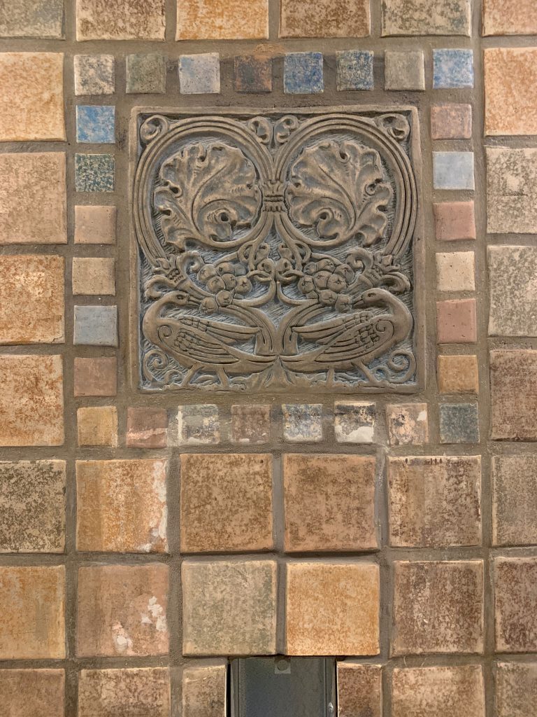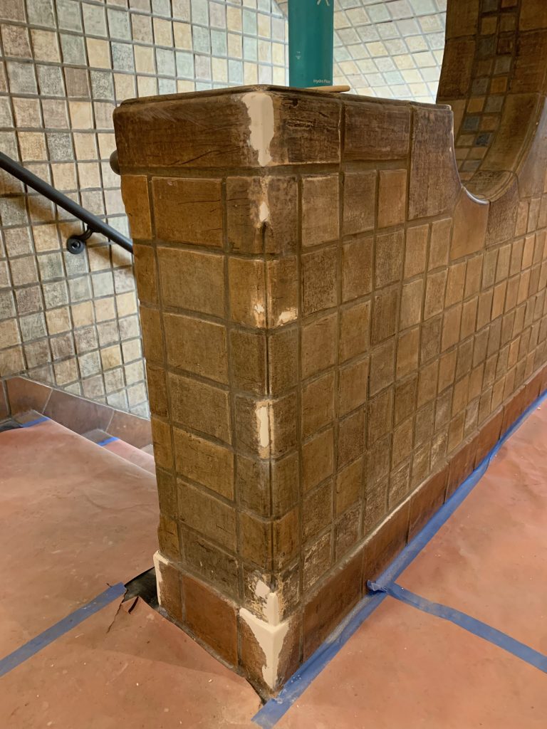 The Lane Building, a badly damaged, Batchelder tile from 1923, downtown Los Angeles, just underwent renovation. It’s unique lobby has a distinct curved archway under the stairs. Spectra Company.