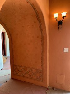 I designed and implemented a stenciled design on a vibrant shade of salmon lime wash. Stencil was based on historical reference of the time period. Hand crafted stencils to fit the geometrically challenging archway.